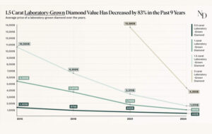 When laboratory-grown diamonds began appearing in commercial quantities in the jewelry market in 2016, prices were slightly less than natural diamonds. Today the prices for laboratory-grown diamonds have fallen by over 80% for 1.5ct, and more for other sizes.